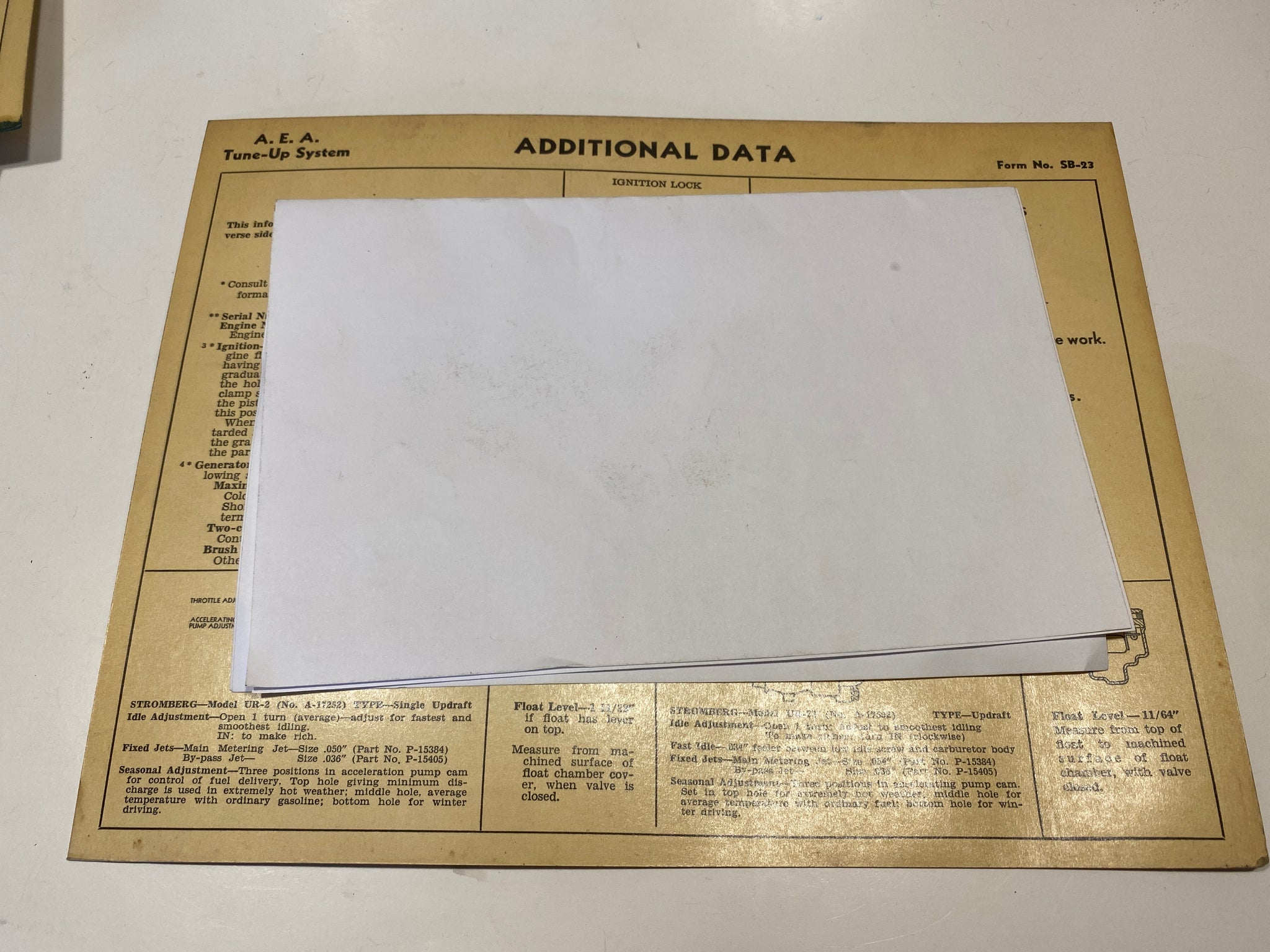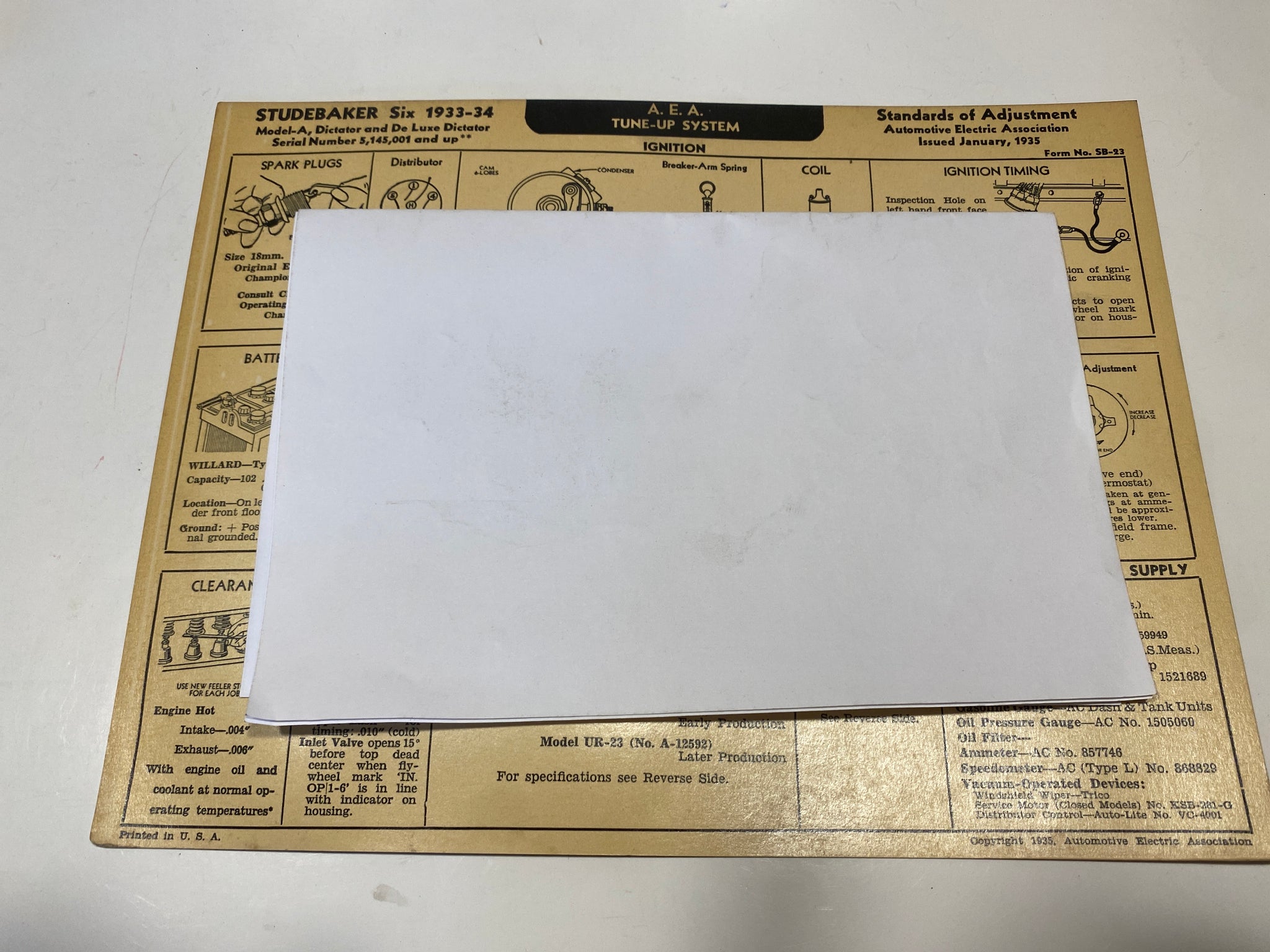 1933-1934 Studebaker Six Model A and De Luxe Dictator AEA Tune Up System card