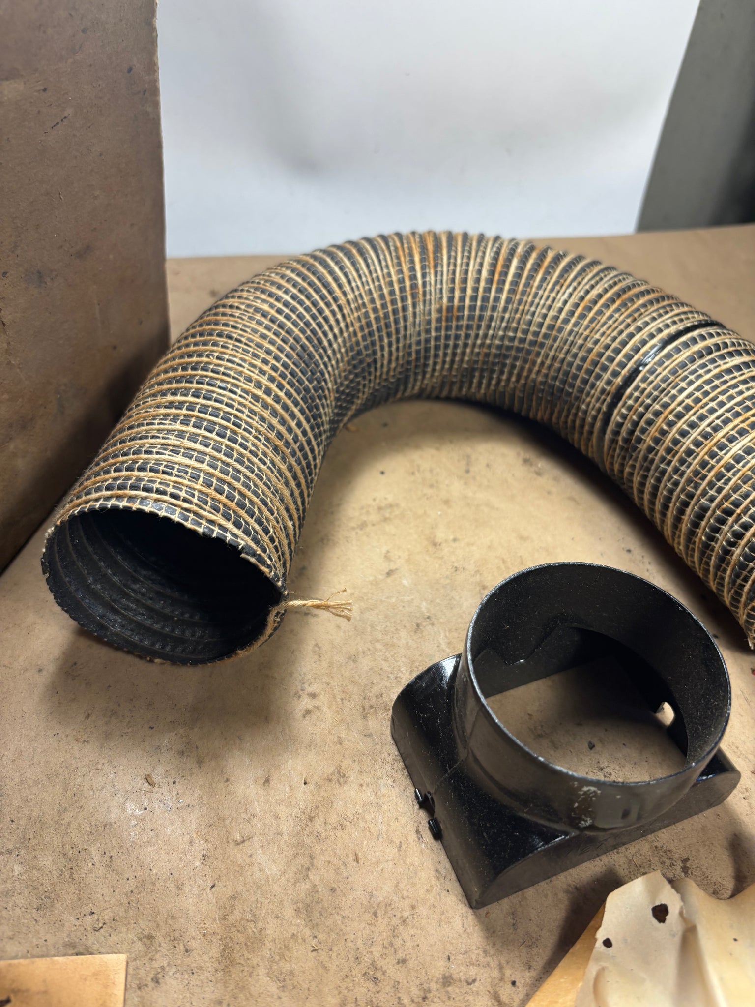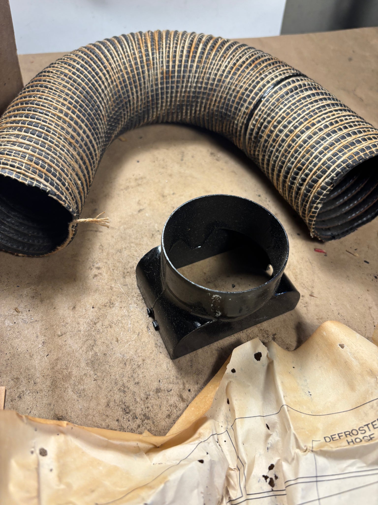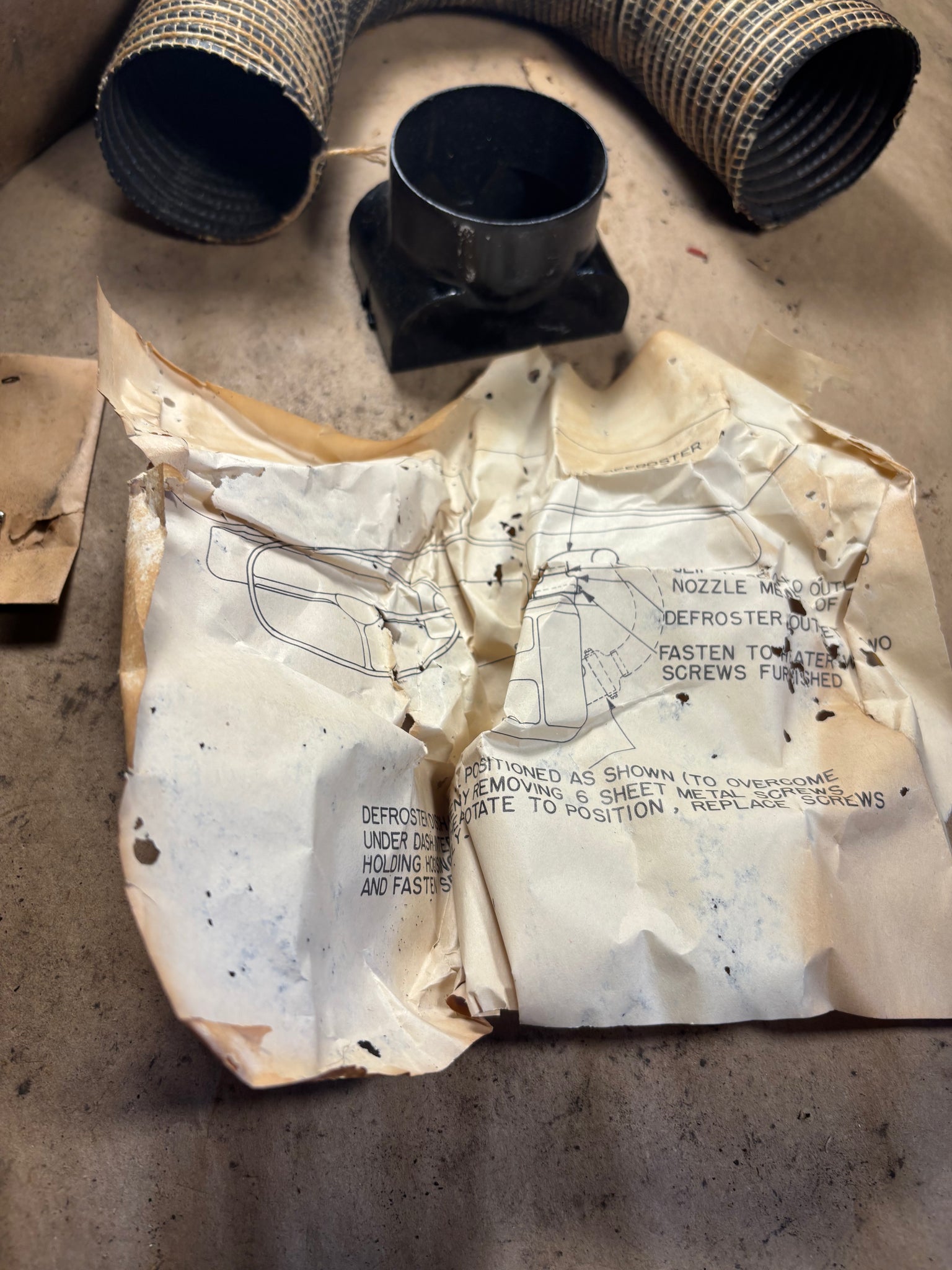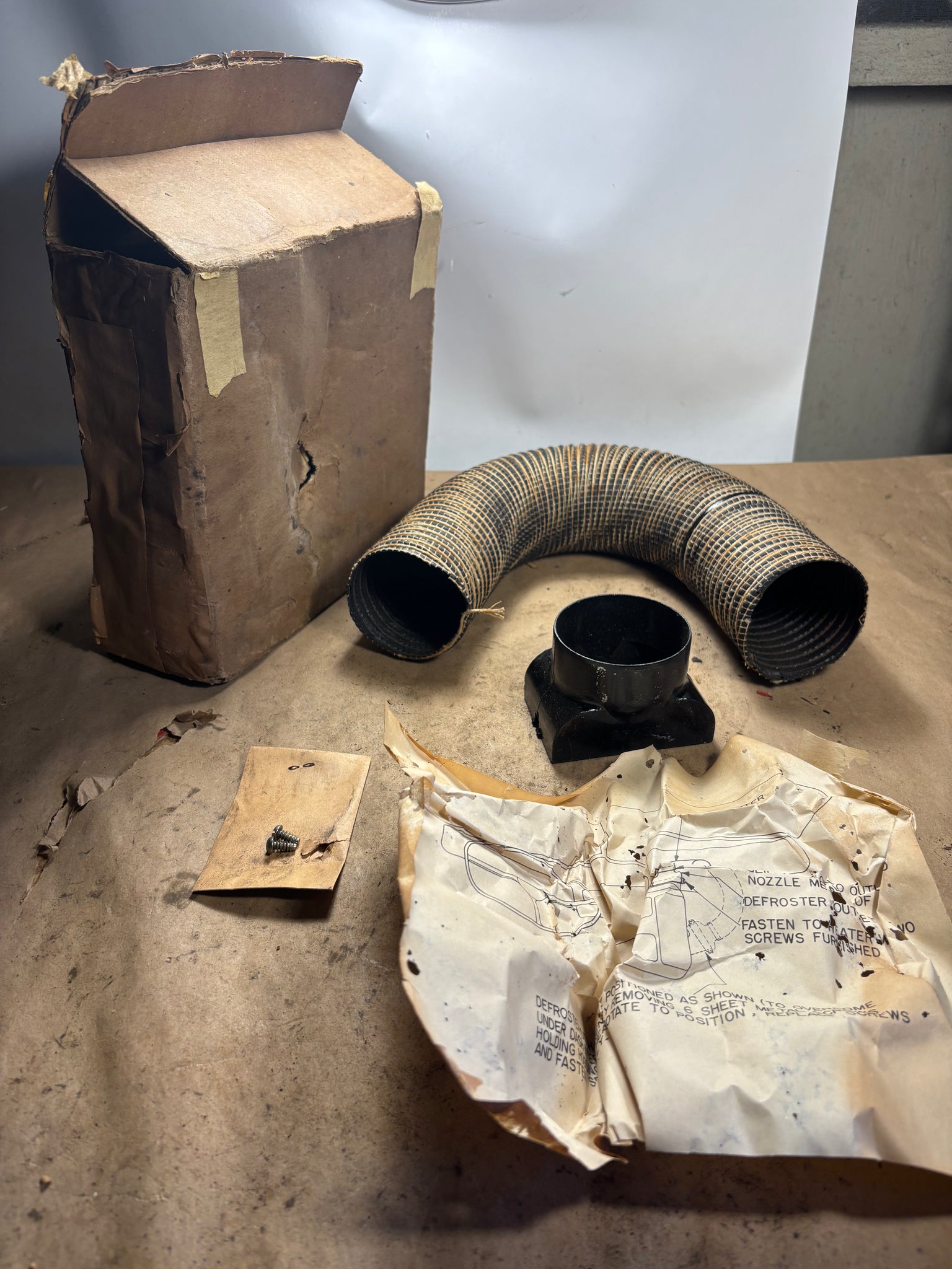 vintage part, probably from the 1950s or earlier. Hose is stiff but I was able to bend it without it cracking so if you’re careful it could work. It has the duct fitting and two screws. Looking at the direction sheet there doesnt appear to be anything missing.